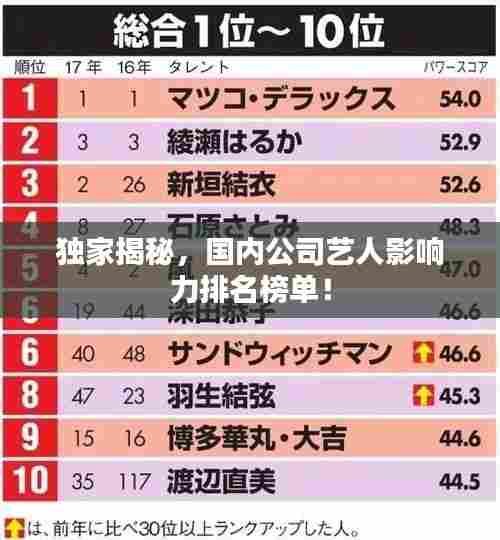 国内娱乐产业在近年来取得了飞速的发展,各大娱乐公司旗下的艺人也随之崭露头角,本文根据影响力、作品表现以及市场关注度等因素,对国内公司艺人进行了排名,排名并不代表一切,每位艺人都有着自己的特色和优势,为观众带来了不同的艺术体验。