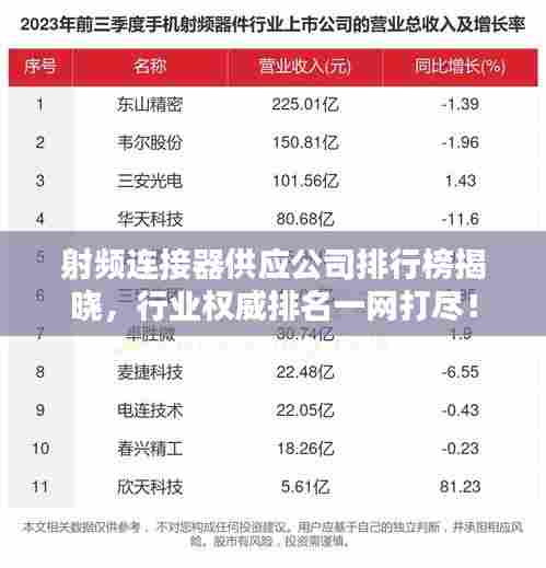 随着无线通信技术的飞速发展,射频连接器作为通信设备的重要组成部分,其市场需求日益旺盛,众多射频连接器供应公司纷纷涌现,为市场提供各式各样的产品和服务,本文将针对射频连接器供应公司进行排名,以便为采购商提供参考。