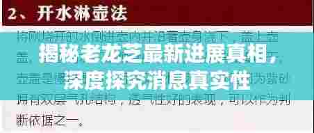 老龙芝作为一个备受关注的项目,其涉及领域广泛,包括经济、文化、科技等多个方面,关于其最新进展的消息往往能吸引大量关注,随着信息的增多,关于消息真实性的疑问也逐渐浮现。