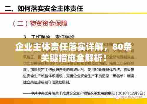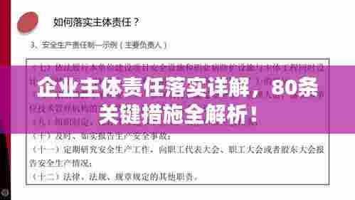 在当今社会,企业的角色日益重要,其承担的社会责任也日益凸显,为深入贯彻企业主体责任,本文详细阐述了落实企业主体责任的80条具体举措,旨在帮助企业更好地履行社会责任,实现可持续发展。